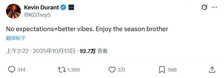 杜蘭特回復道:“沒有期待=更好的氛圍。享受這個賽季吧兄弟。”