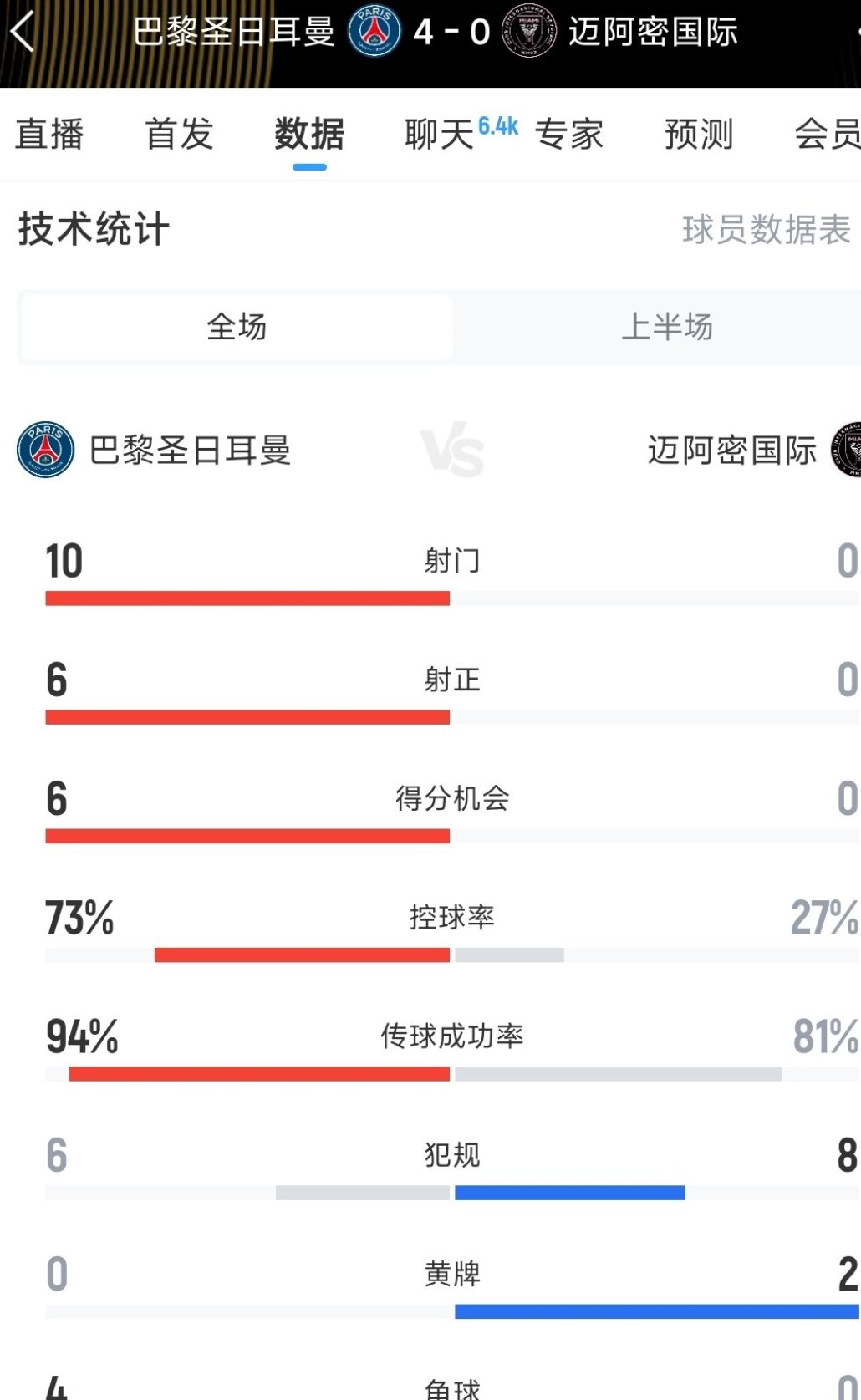 06月30日訊 世俱杯1/8決賽,巴黎圣日耳曼vs邁阿密國際。上半場(chǎng)比賽結(jié)束,巴黎4-0領(lǐng)先邁阿密。半場(chǎng)數(shù)據(jù)如圖所示。