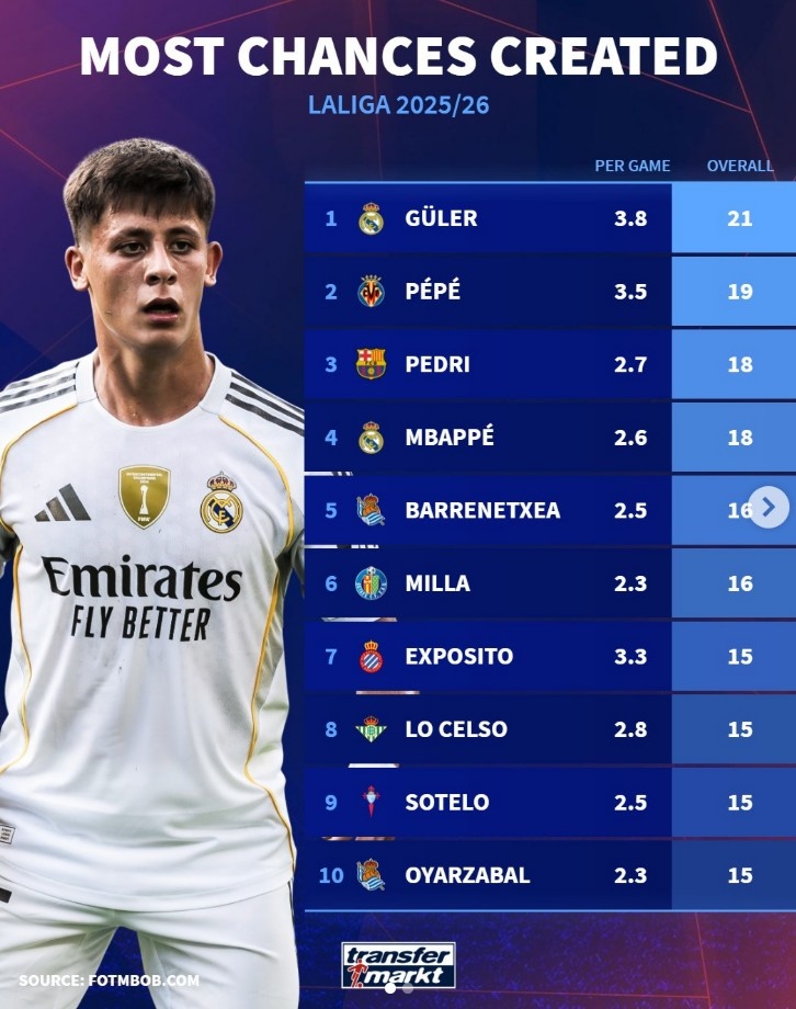 9月30日訊 德轉(zhuǎn)盤點(diǎn)了本賽季西甲創(chuàng)造機(jī)會(huì)榜單,其中居勒爾共計(jì)21次創(chuàng)造機(jī)會(huì)居首,具體如下(場(chǎng)均數(shù)據(jù)+總數(shù)據(jù)):