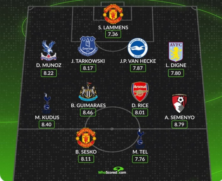 10月6日訊 WhoScored列出了英超第7輪比賽最佳陣容,舍什科、特爾、賴斯、拉門斯入選。