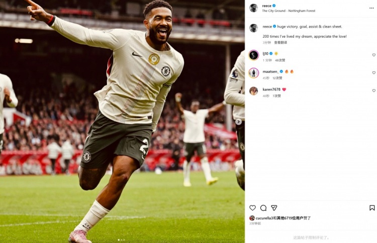 本場比賽里斯-詹姆斯迎來球隊生涯200場里程碑,并且傳射建功。他在賽后社媒曬照寫道:“一場大勝,并且取得進球和助攻,完成零封,200次出場實現(xiàn)夢想,感謝大家的愛!”