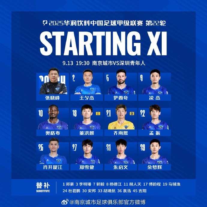 2025華潤飲料中甲聯(lián)賽第22輪,南京城市VS深圳青年人 首發(fā)名單出爐,讓我們并肩戰(zhàn)斗!